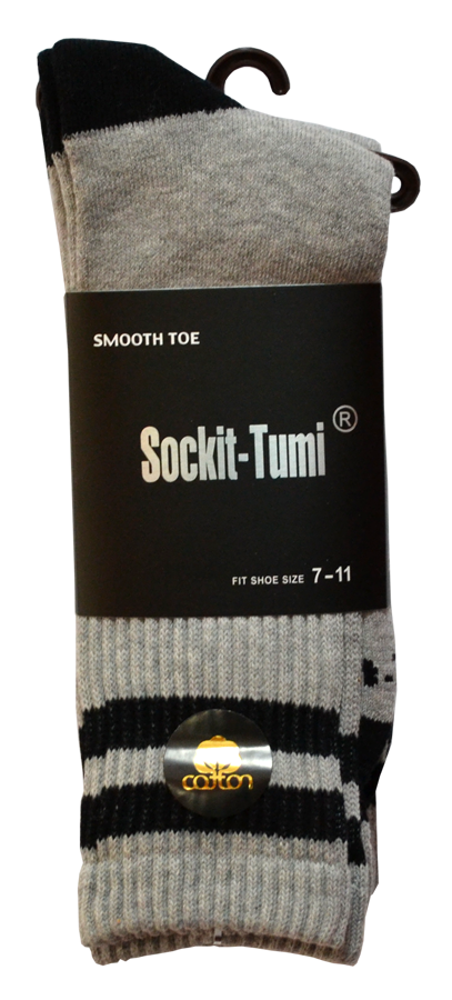 Color: Grey with Black Stripes Size Range: 7-11 Materials: 95% COTTON/5% NYLON & ELASTANE Minimum Order: 4 Packs Description : Men's cotton sports socks (PACK OF 3)