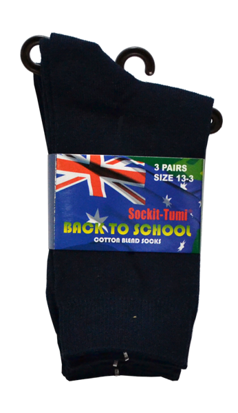 Color: Navy Blue Size Range: 13-3 Age: 8-10 year old Materials: COTTON and SPANDEX Smooth Toe Minimum Order: 4 Packs Description : Kids cotton school socks (pack 0f 3)