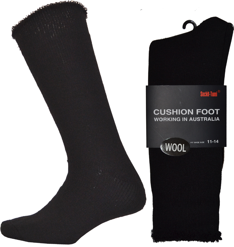 Color: Black Size Range: 11-14 Materials: WOOL 80% ACRYLIC 15% and ELASTANE 5% Minimum Order: 1 Dozen Description : Men’s Full Cushion Heavy Duty Wool Work Socks
